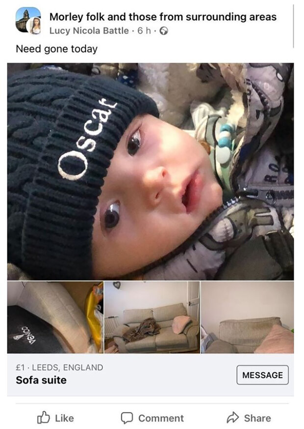 Žena umístila reklamu na Facebooku a spolu se snímky pohovky z různých úhlů omylem připojila fotografii svého sedmiměsíčního syna Oscara.