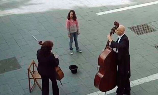 Dívka byla ponechána, aby poslouchala neobvyklé představení. Téměř okamžitě se však k hudebníkovi přiblížila kolegyně. Žena se připojila k večírku s vlastním strunným nástroje.