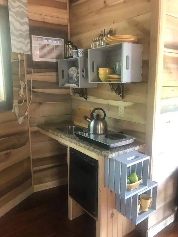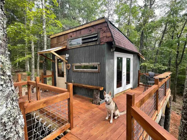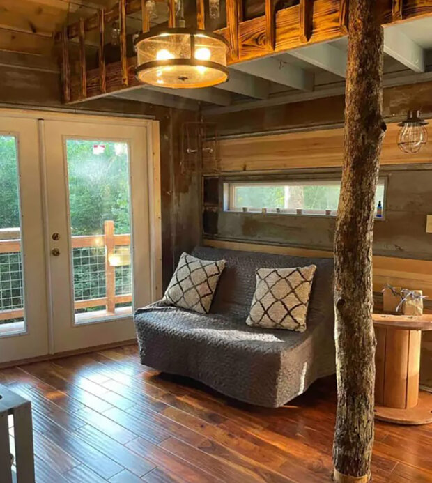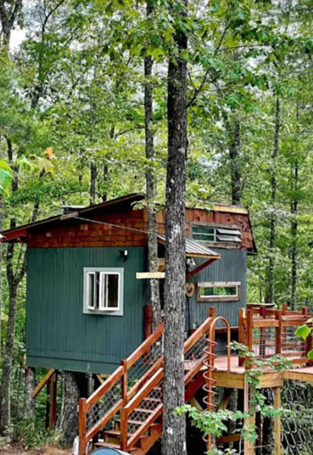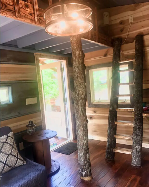 Dům je dvouúrovňový, do druhého patra se lze dostat po schodech. Také dům má vlastní terasu, zipline, trampolínu. Noc v takovém domě bude stát 150 dolarů.