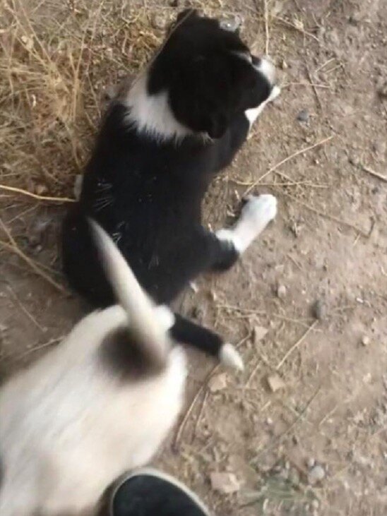 Lidé sledovali fenku. Vedla je do zničené budovy, kde se schovávala její štěňátka. Přátelé viděli, že jeden z nich má potíže - drobeček měl na hlavě plastovou nádobu. Zjevně do něj zvědavé štěňátko strčilo hlavu, ale nemohlo vytáhnout. Ani jeho matka nemohla pomoci. Proto se rozhodla zavolat lidí.
