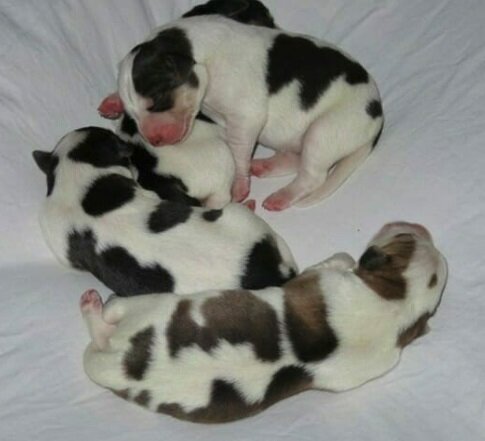 Štěňata mají bílou barvu s černými nebo hnědými skvrnami.