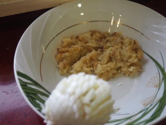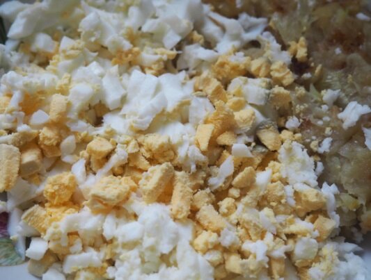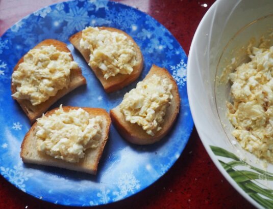 Hodně cibule osmažené na rostlinným oleji a vajíček (poměr 1:1). Sůl, pepř. Lžíčku majonézy, pokud chcete. Tuto pomazánku namažeme na topinku a hotovo!