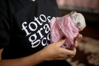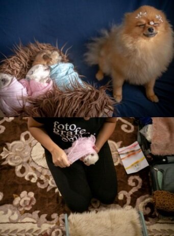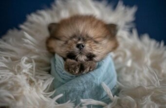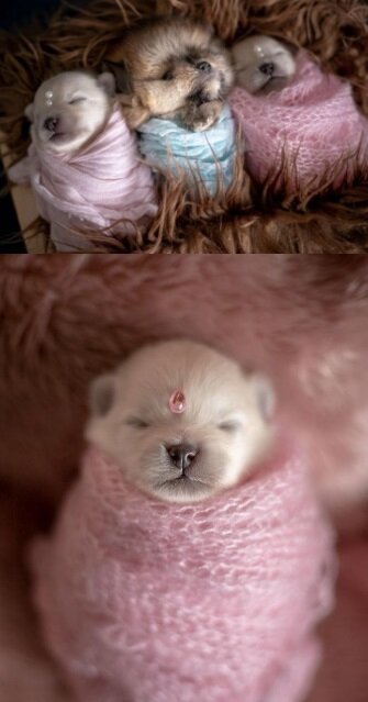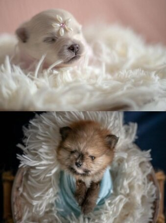 Brazilská fotografka Karen Silva zaexperimentovala a uspořádala focení štěňat špica tak, jak se obyčejně fotí novorozené děti: v zavinovačce a košících.