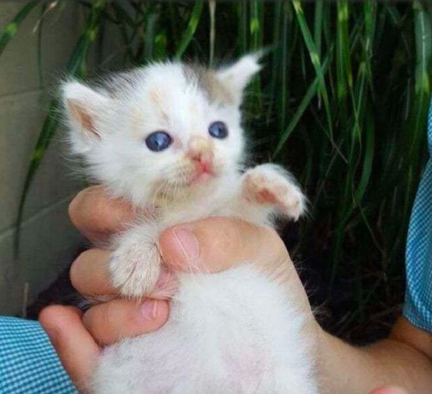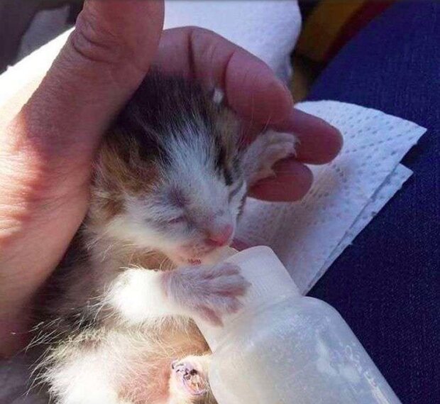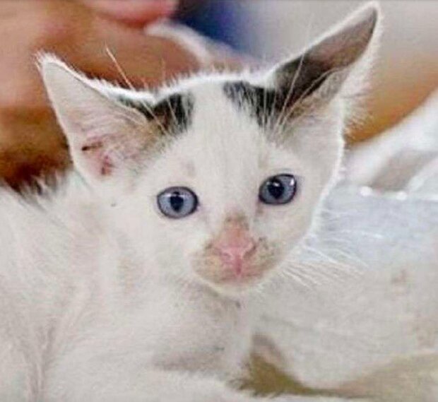 Malé zvířatko bylo ve velmi špatném stavu: jedna noha byla zlomená a ostatní byly infikováné. Dívka vzala mladě k veterináři. Bohužel jednu tlapu nepodařilo se zachranít. Kotě muselo udělat první kroky na třech nohou.