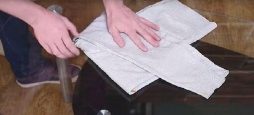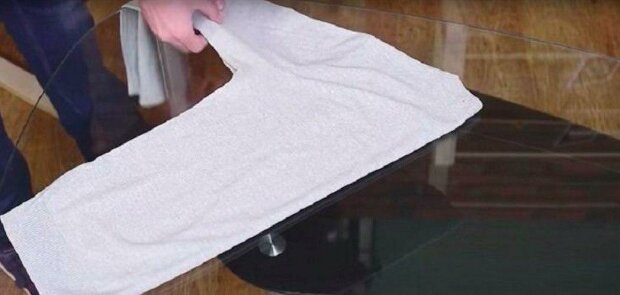 Položte svetr na hladký povrch. Přeložte ho napůl jako na fotce níže.