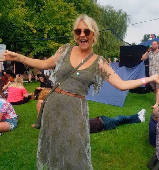 Jediný člověk, který ví, že se jedná o šaty ze svatby, je můj manžel. A to proto, že mu o tom neustále říkám. Souhlasil se mnou, jelikož šaty byly čertovsky drahé, a přeci nebudou jen tak ležet ve skříni. Nyní je pravidelně nosím na vystoupení s naší skupinou LÅTE.