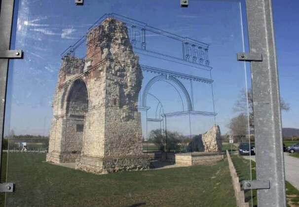 Skvělý nápad – vedle ruin je stojan s ukázkou o původním tvaru a velikosti stavby